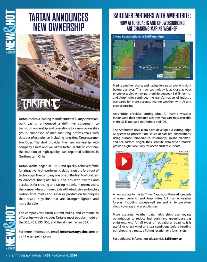 SailTimer Partners with Amphitrite: How AI Forecasts and Crowdsourcing Are Changing Marine Weather. Latitudes & Attitudes magazine, March/April, 2026, page 112. Screenshot.